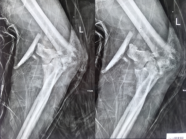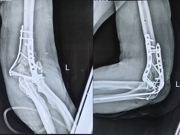 圖為 患者受傷部位圖,即左手肘部關(guān)節(jié)呈開放性、粉碎性骨折并伴有骨質(zhì)缺損