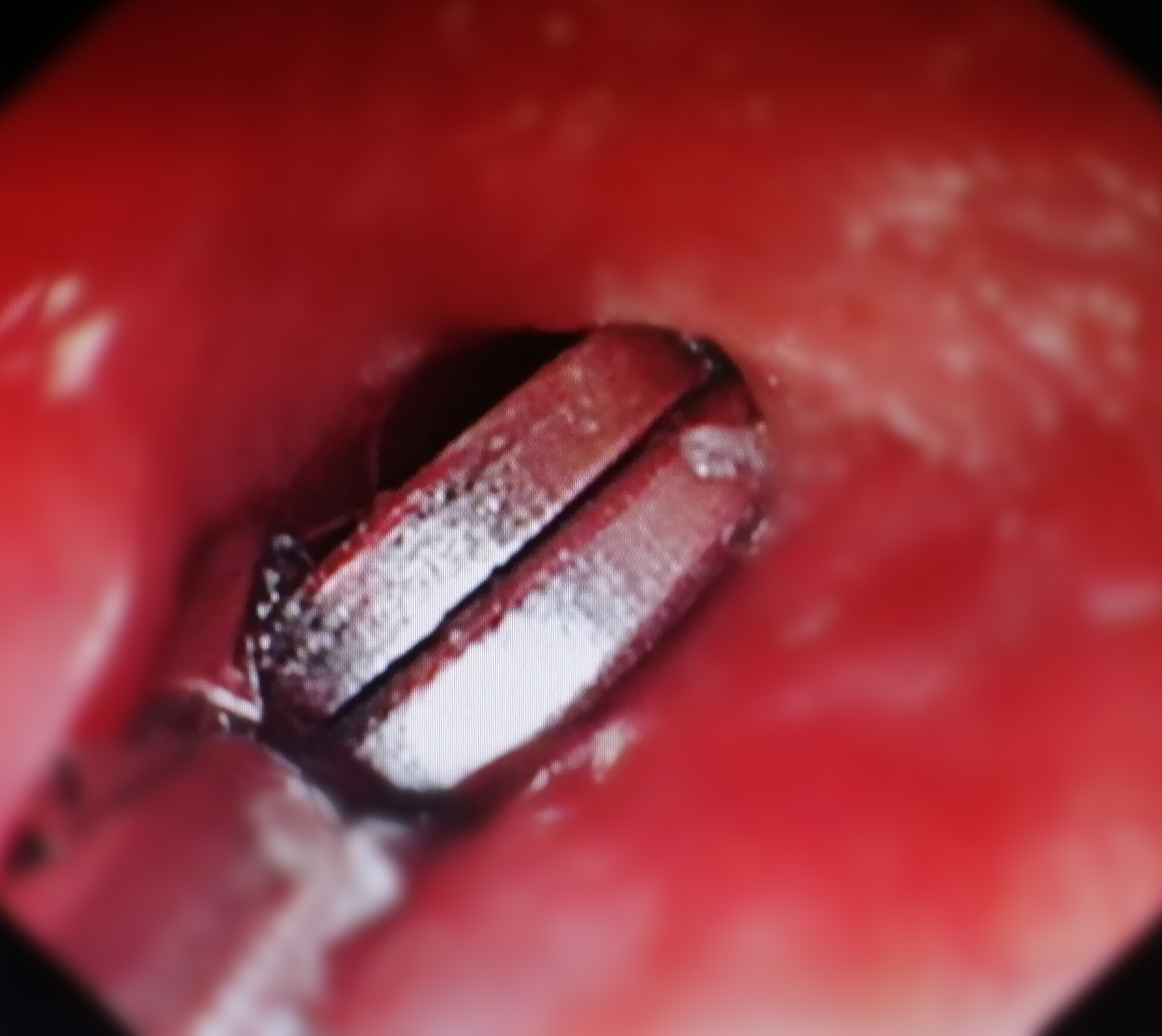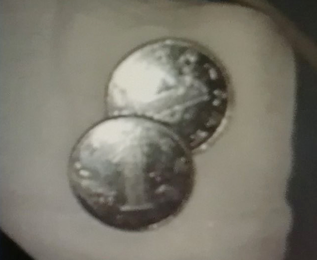 經食管CT檢查,被吞入的硬幣卡在小女孩的食道內,若不及時取出,極易引起食管周圍發炎及膿腫,甚至導致穿孔。根據病情,消化內科黨支部書記、消化內科二病區副主任夏揚潮副主任醫師當機立斷,制定嚴密的治療方案,禁食8小時,送小女孩至手術室行氣管插管全麻經食道內鏡異物取出術,夏揚潮副主任用內鏡慢慢進入食道,在距門齒約13厘米處見兩枚銀白色硬幣嵌頓,兩枚硬幣猶如“雙胞胎”似的整齊的嵌卡在那,經過醫護人員的默契配合,這兩枚“惹事”的硬幣被一起順利取出。當小女孩父母看到取出的硬幣時,既驚嚇又欣喜,驚嚇的是竟然是兩枚粗厚的一元硬幣,欣喜的是硬幣已經被順利取出,食管粘膜無損傷。夏揚潮副主任說:“萬幸這‘雙胞胎’卡在了食道,如果卡在氣道后果將不堪設想。”