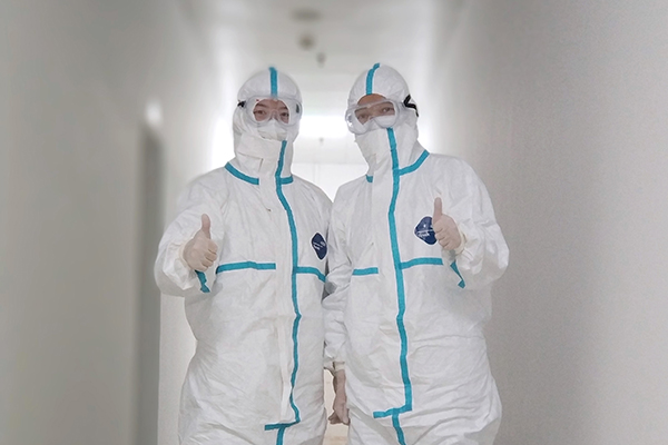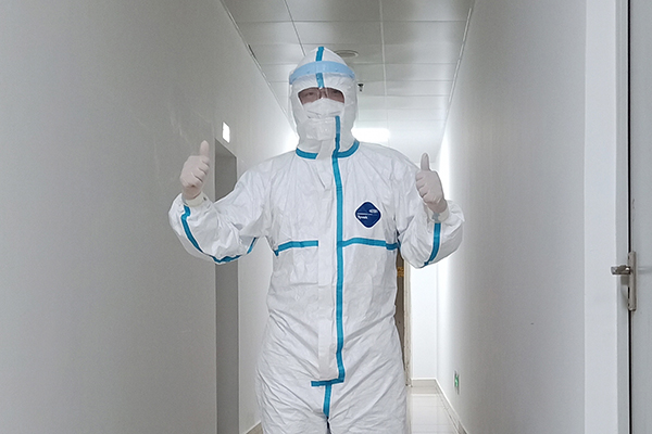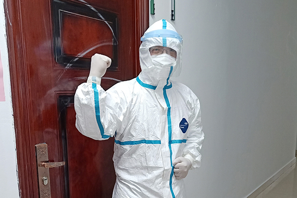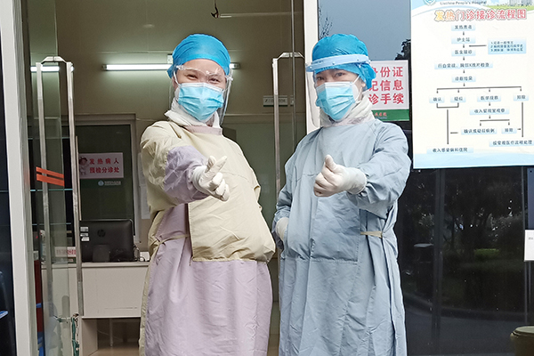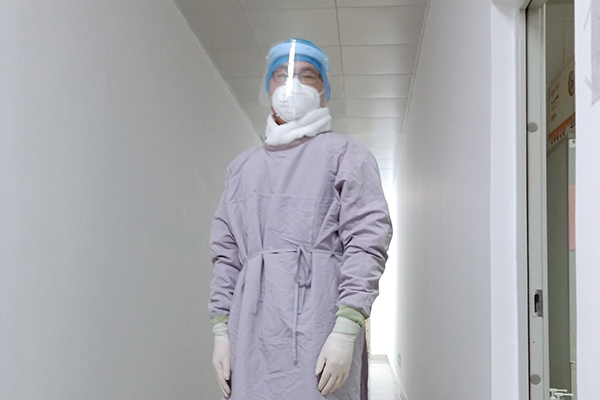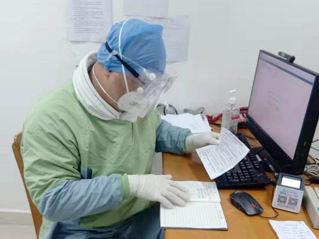 腫瘤科李旌、秦佳寧、李中華、郭旭飛等醫(yī)生加入發(fā)熱門診一線工作。穿上密不透風(fēng)的防護(hù)服,戴上N95口罩,加上眼鏡、面屏,還未到診室,視線已模糊,但是透過面屏我們看到的是他們堅(jiān)毅和自信的目光。不同于病房診療工作,這里需要對(duì)就診人員反復(fù)、詳細(xì)地進(jìn)行流行病學(xué)史詢問,不遺漏一個(gè)病例,結(jié)合臨床表現(xiàn)檢查結(jié)果慎重排查。時(shí)刻嚴(yán)格落實(shí)醫(yī)院感染管理制度,避免院內(nèi)交叉感染。為了節(jié)約防護(hù)用品的損耗,他們上班前不敢多喝水。他們說:“這是我們的主戰(zhàn)場(chǎng),大局當(dāng)前,舍我其誰!”