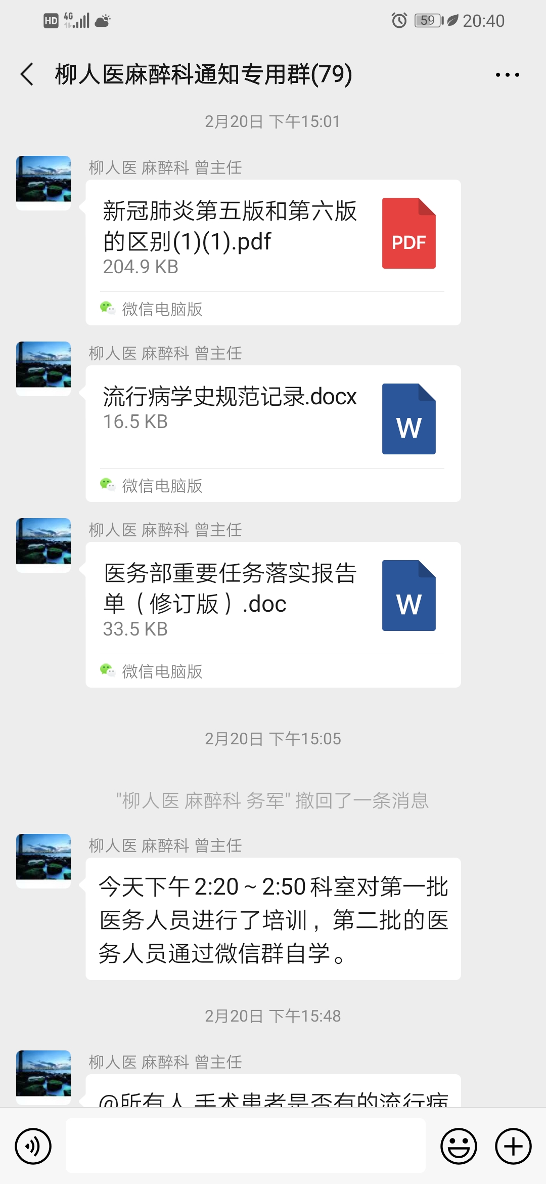 疫情期間,科室防控小組組建了微信群,在群內(nèi)對(duì)國家發(fā)布的每一版新冠肺炎診療指南及知識(shí)更新組織大家在線學(xué)習(xí),并結(jié)合自身情況、疫情變化對(duì)科室工作進(jìn)行及時(shí)調(diào)整和指導(dǎo)。醫(yī)生和護(hù)士還對(duì)防護(hù)服的穿脫進(jìn)行演練并將其拍成了視頻,以供醫(yī)護(hù)人員學(xué)習(xí)。