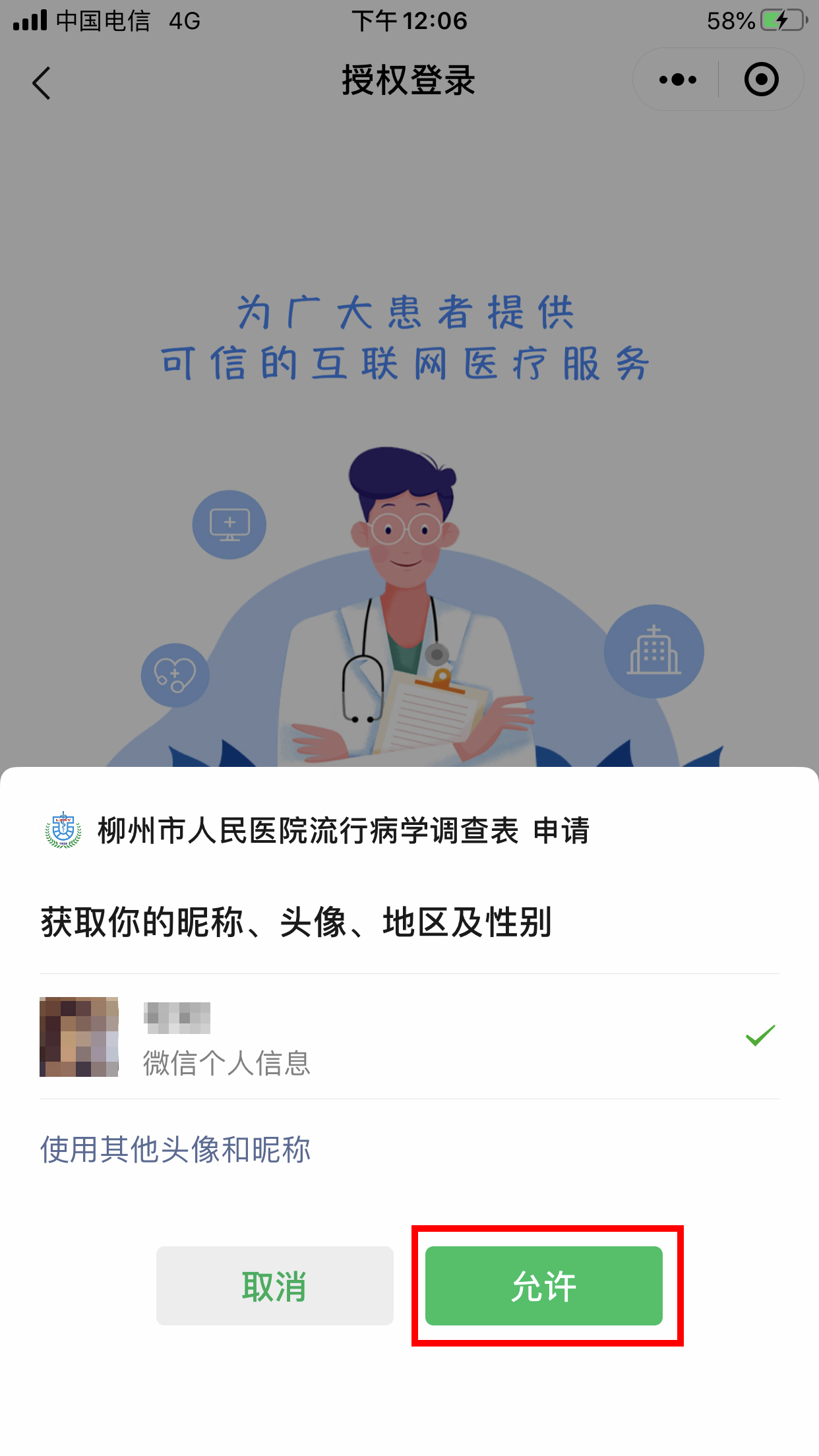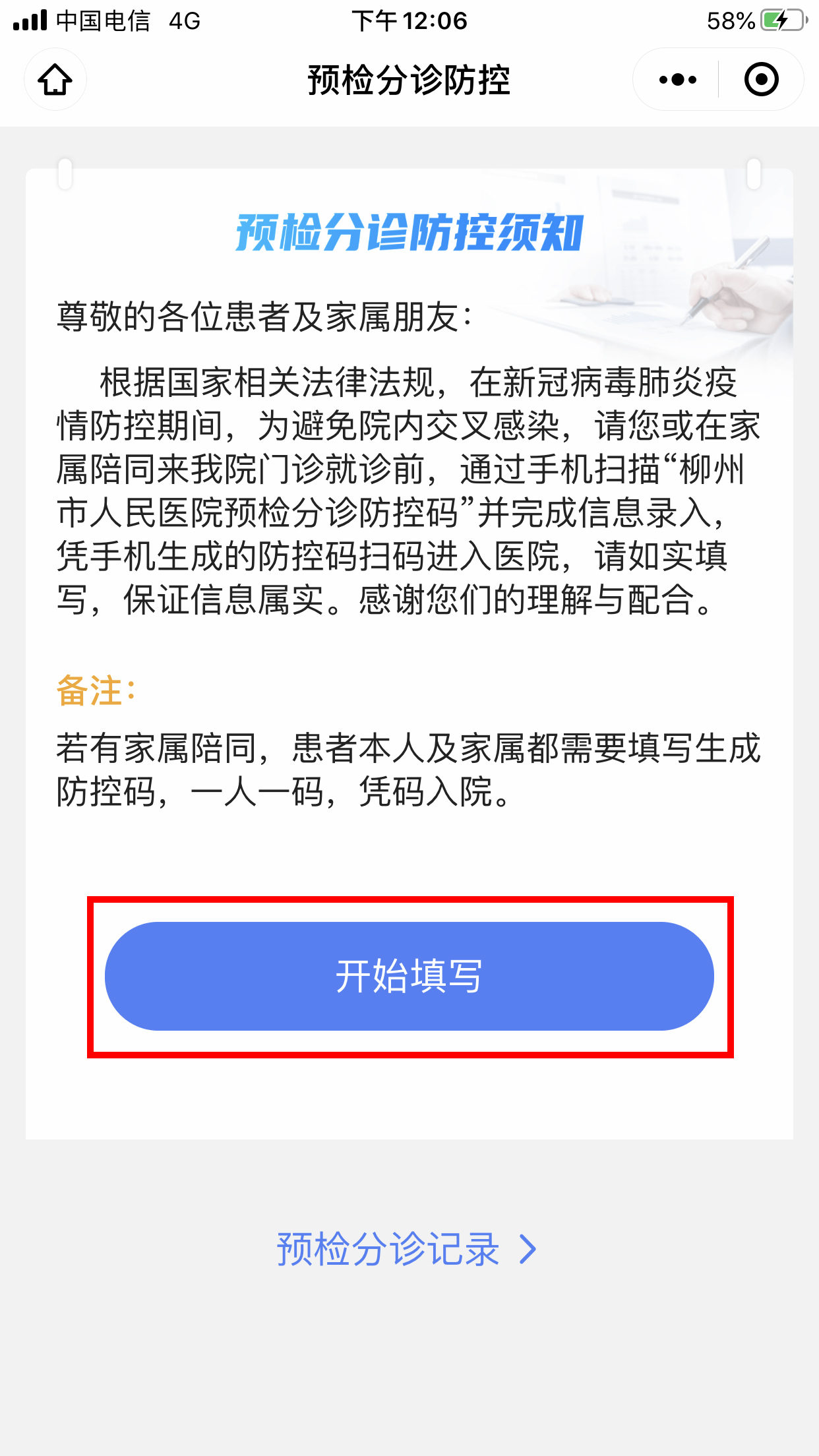 2、通過手機端預約的患者關注柳州市人民醫院公眾號,填寫《流行病學調查表》,提前獲取二維碼,候診及就診時需向醫務人員出示。