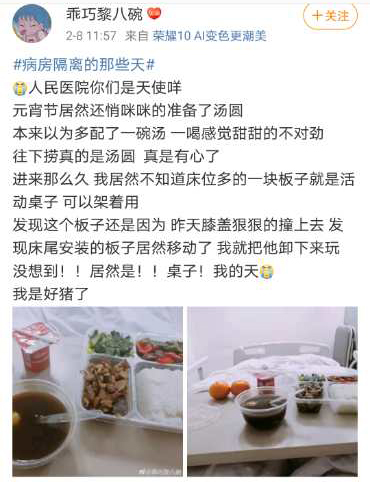 “市人民醫院你們是天使嗎?元宵節還給我送湯圓……”8日晚,微博上的一名昵稱為“乖巧黎八碗”的網友,把自己在市人民醫院隔離時,經歷的暖心小故事發網上,獲得了評論近3000條,轉發更是接近過萬,贏得點贊一片。