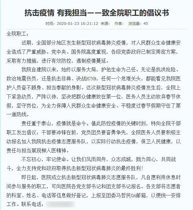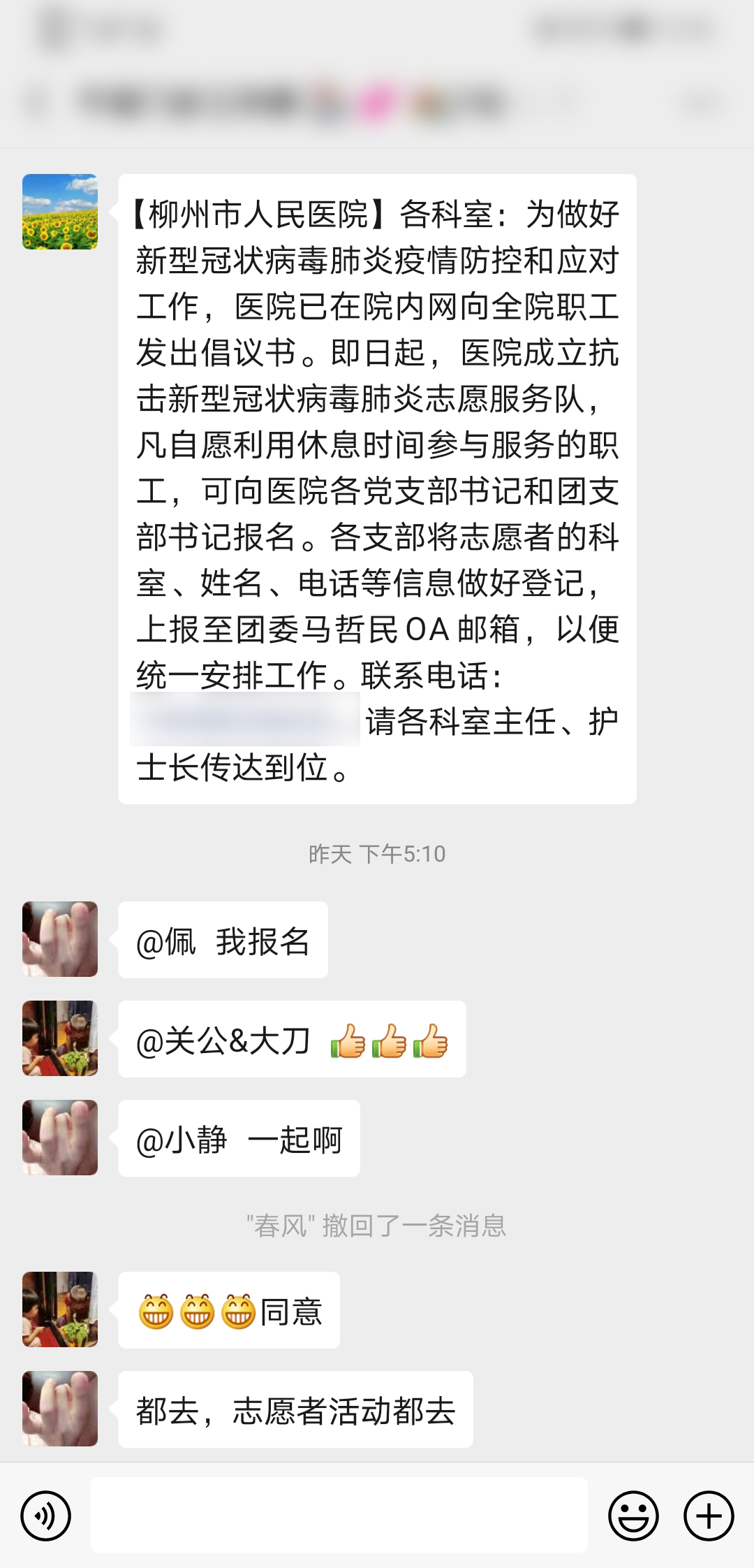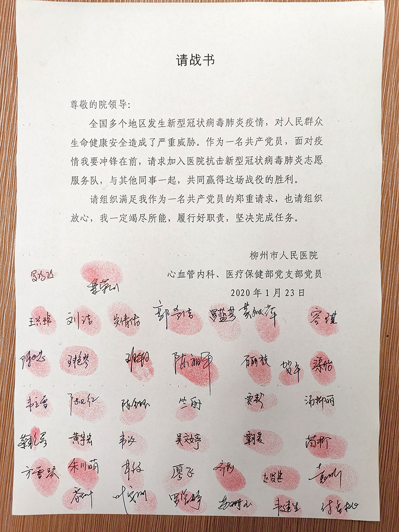 1月23日,醫院黨委召開動員會,向全院職工發出倡議:“干部要沖鋒在前,黨員團員要奮勇爭先”“要以實際行動抗擊疫情,保衛人民健康,以責任與擔當展現柳人醫精神”。倡議書發出后來自各黨支部、各科室的請戰書就如雪片般飛來,短短幾個小時就有千人報名,主動請戰,申請加入醫院抗擊疫情志愿服務隊,決心打贏這場疫情防御戰。截止目前,報名仍在持續進行中。