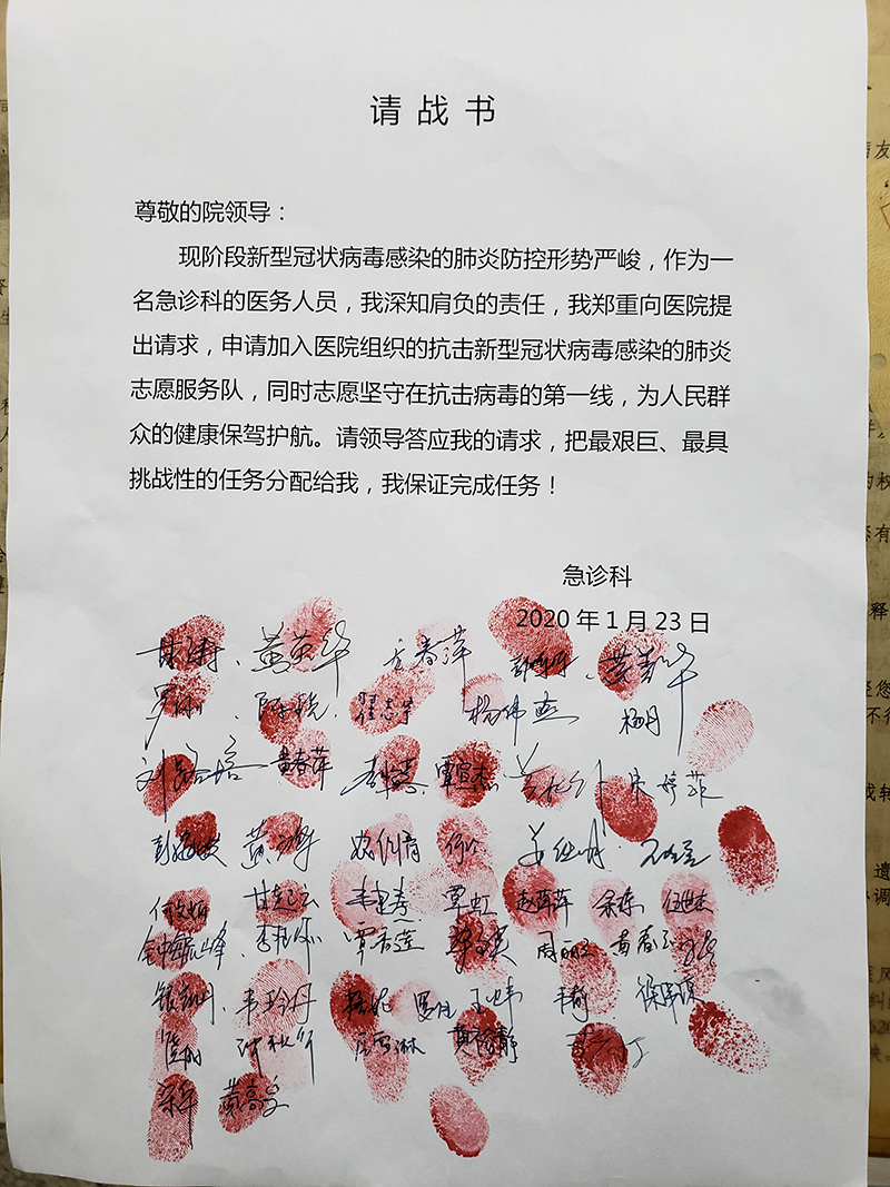 “作為一名急診科的醫務人員,我深知肩負的責任,……志愿堅守在抗擊新型冠狀病毒感染肺炎的第一線,為人民群眾的健康保駕護航。請領導答應我的請求,把最艱巨、最具挑戰性的任務分配給我,我保證完成任務!”急診科作為接診患者的最前線,擔子重、強度大、風險高。但急診科的醫務人員沒有畏懼退縮,而是迎難而上,用請戰書的形式,表達了自己不忘初心使命、守護人民健康的決心和信心。“我們急診科一定守好陣地,做到守土有責、守土盡責,疫情不解除,我們絕不收兵!”該科負責人甘濤語氣堅定地說。