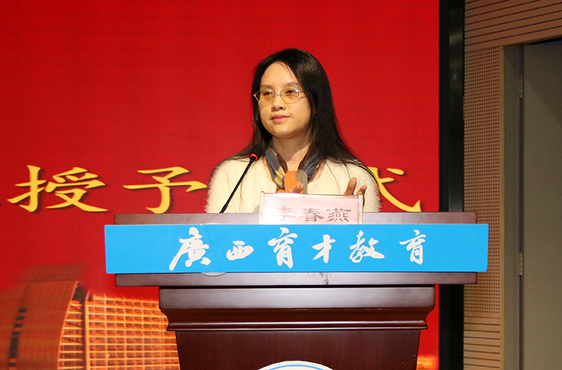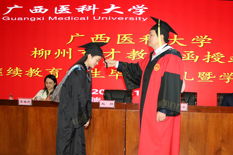 劉慶委副院長宣讀了2020屆繼續教育畢業生、優秀畢業生以及學士學位文件和名單,并對2020屆畢業生順利畢業,取得學士學位表示祝賀。出席領導給優秀畢業生、畢業生代表頒發榮譽證書及畢業證書。廣西醫科大學繼續教育學院院長趙邦教授為獲得學位的畢業生進行了圣神的撥穗儀式。廣西育才教育集團聯合黨委書記、董事長、函授站站長蔣華,廣西醫科大學繼續教育學院副院長李春燕為典禮作致辭,希望他們不忘母校,謹遵老師教誨,銳意進取,再創輝煌。