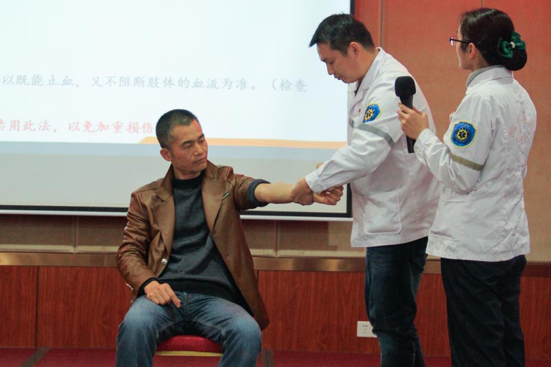 活動中,急診科農繼飛醫生首先為員工們進行一氧化碳中毒防治知識講解,通過圖文并茂的幻燈片、通俗易懂的語言,讓員工們深入淺出地掌握預防一氧化碳中毒的知識和中毒后的急救方法。應職工們的熱情要求,農醫生還給大家講解了止血包扎急救技術,邀請現場職工互動,邊講解邊演練,得到了大家熱烈的響應。