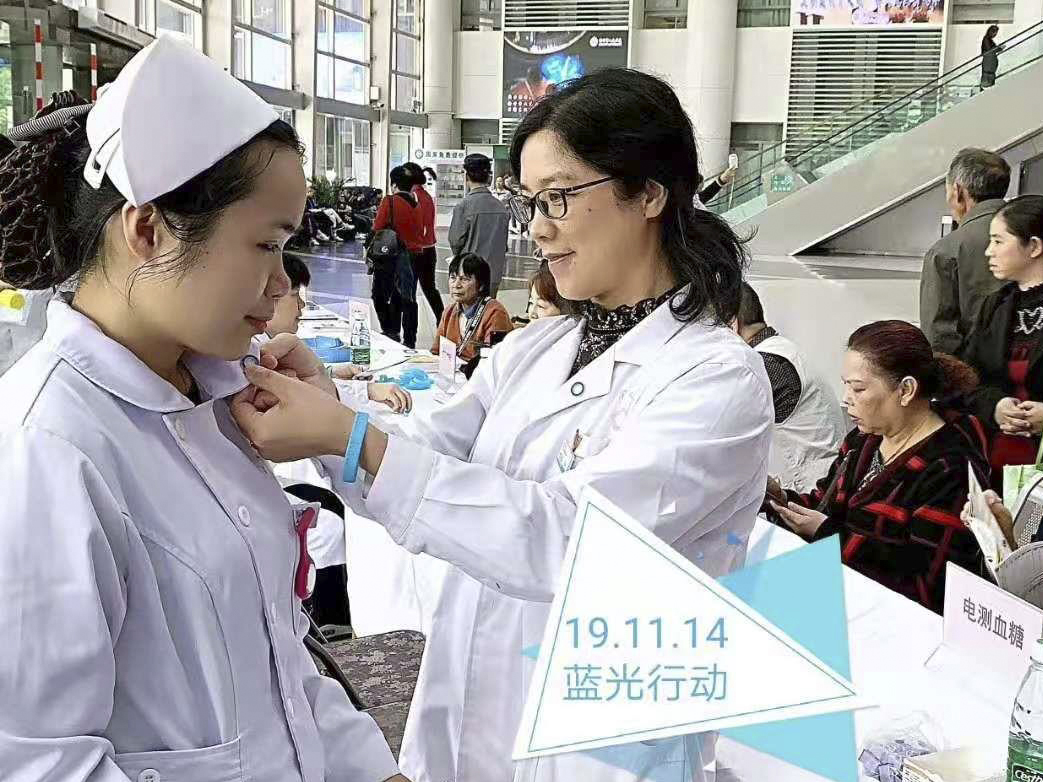 11月14日還是聯合國糖尿病日中國藍光行動十年紀念日。我內分泌科醫護人員均佩戴藍色徽章及腕帶,響應“共繪健康藍!點亮希望燈”的理念。