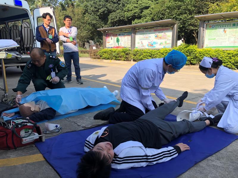 演練在上午10點正式開始。模擬因小車失控車禍致3人不同程度受傷,1人死亡的現(xiàn)場。我院急診科接到120指揮中心派單指令后立即出診。120急救車到達事故現(xiàn)場急救人員立即進行傷員檢傷和分類,根據(jù)傷員出現(xiàn)臨床癥狀和體征分四類,根據(jù)衛(wèi)健委的統(tǒng)一規(guī)定用紅、黃、綠、黑不同顏色分別代表危重、重、輕、死亡四類不同傷情。現(xiàn)場急救原則:先救命后治傷,先重后輕,先排隊后施救,先救活人后處置尸體。救命為主,立即實施現(xiàn)場急救。迅速及時轉(zhuǎn)運,做好現(xiàn)場記錄,途中注意監(jiān)護。