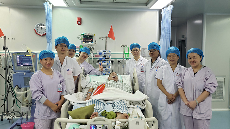 ECMO、血液灌流機、呼吸機圍繞在患者身旁不知疲憊的運轉著,傳遞生的希望,醫護人員小心謹慎地穿梭于患者與儀器之間,根據病情需要及檢驗指標動態調整機器參數。入院期間,患者病情反復,多次突發室速、室顫,共實施電復律及電除顫10余次,每一次的病情突變都嚴峻考驗著醫護人員的搶救技術和心理素質。最終,經過團隊的不懈努力,蔣大爺的自主循環逐漸穩定,陸續撤離ECMO、呼吸機,停止血液灌流,在醫護人員及親人們深情的呼喚中清醒過來。曾經病床上奄奄一息的老人,如今已轉入康復醫學科接受康復治療,等待回歸家庭安享晚年。
