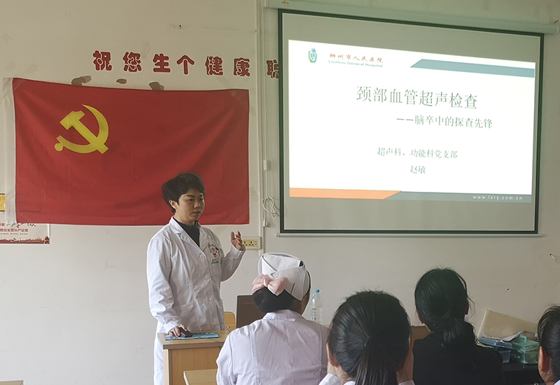 最后,為提高沙塘鎮衛生院醫護人員的醫療救治能力,由我院神經內科陳紅主任醫師及超聲科趙敏副主任醫師分別為沙塘鎮中心衛生院門急診全體醫護人員進行了“急性缺血性腦卒中早期識別與處理”和“頸部血管超聲檢查——腦卒中的探查先鋒”的主題培訓。