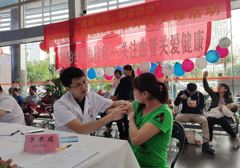 為了迎接第6個“世界血栓日”,進一步落實大衛(wèi)生、大健康理念,呼吁廣大民眾養(yǎng)成良好的生活方式,關(guān)注血管,防治血栓,守護健康。10月14日,柳州市人民醫(yī)院血管外科聯(lián)合超聲科在醫(yī)院門診大廳開展了“2019年世界血栓日-關(guān)注血管 關(guān)愛健康”大型義診活動。