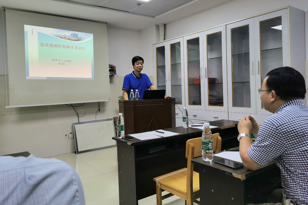 隨后,柳州市人民醫院潘光棟副院長作致辭,感謝融水縣人民醫院外三科主任廖永鋒及其團隊對本次學術交流活動能順利開展的付出,并希望融水縣人民醫院能夠大力支持柳州市人民醫院肝膽胰外科開展柳州市肝癌的早期篩查工作。緊接著潘光棟副院長進行了《直腸癌肝轉移進展》的講座,其從結直腸癌肝轉移的特點、手術治療適應癥及選擇、新輔助治療等方面介紹了直腸癌肝轉移的進展。