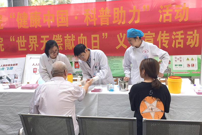 2019年6月14日是第16個世界獻血者日,主題是人人享有安全血液。為慶祝世界獻血者日,6月14日,我院輸血科、預防保健科和宣傳科聯合在門診大廳舉行義診宣傳活動,現場發放無償獻血宣傳資料、免費測血型及現場接受咨詢等宣傳活動,并通過LED屏宣傳無償獻血知識、臨床用血政策,同時播放2019年世界獻血者日宣傳片。