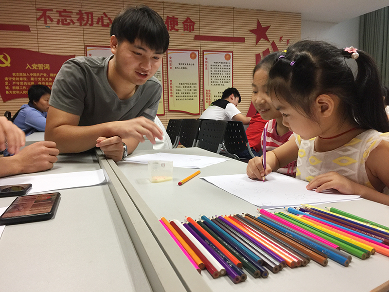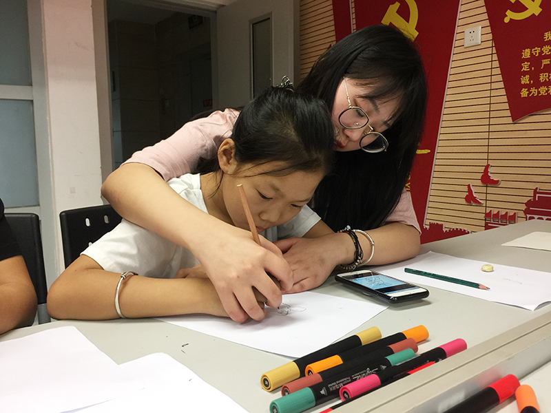一幅幅充滿童趣的圖畫,十幾名小朋友圍坐在桌子旁,在身邊大學生志愿者的引導下,用各色畫筆,盡情地在白紙上釋放著自己的藝術才能,家長們則面帶笑容,不時用手機記錄下孩子快樂的時刻,歡聲笑語充滿著整個課堂。