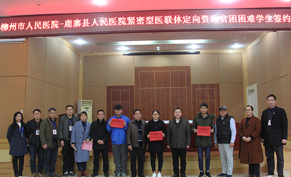 2019年2月21日下午,柳州市人民醫院-鹿寨縣人民醫院緊密型醫聯體定向資助家庭困難學生簽約儀式在鹿寨縣人民醫院舉行。鹿寨縣縣委常委、宣傳部部長、副縣長陳波,鹿寨縣衛計局局長陶蕊、黨組書記廖健銘,鹿寨縣教育局局長賴金華,柳州市人民醫院醫務部副部長、質控科科長黃振宇,鹿寨縣人民醫院院長曾鴻毅、黨委書記蘇春蓉,以及獲得資助的學生和家長出席簽約儀式。