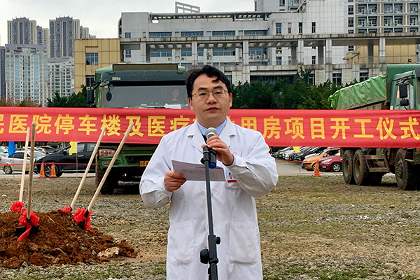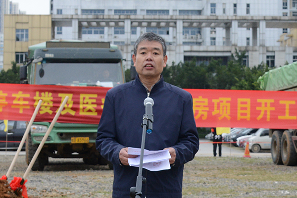黎榮山副院長在致辭中對市委市政府的高度重視與親切關懷,對各相關部門、單位的大力支持表示誠摯感謝,并作簡要項目介紹。我院停車樓總建筑面積40460.56平方米,總共8層(含地下2層),工期約2年。建成后新增車位1013個,全院車位達到2700余個,基本滿足停車需求。項目第6層,計劃建設成為生物樣本庫、動物實驗中心、計算機中心等醫療輔助用房,進一步補充完善醫院科研基礎設施,實現“科教興院”的目的。