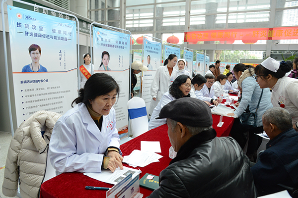 為貫徹落實國家衛(wèi)生健康委健康扶貧工作,加強我國傳染病的防治,提高西部及貧困地區(qū)的肝炎防治及公眾健康素養(yǎng)。2018年12月14日上午,柳州市人民醫(yī)院迎來了多位全國著名肝病專家,共同在我院門診大廳舉辦“扶貧攻堅 健康同行——肝炎健康促進與防治項目” 2018大型義診活動(廣西第二站)。該活動由國家衛(wèi)生健康委疾病預(yù)防控制局指導(dǎo)、中國健康促進基金會主辦,柳州市人民醫(yī)院承辦。