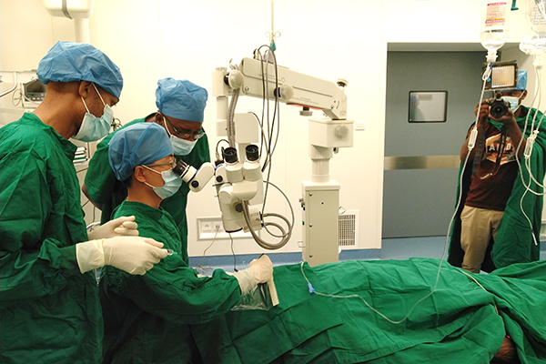 中午12:30,手術正式開始。在付鵬主治醫師、桂林醫學院附屬醫院俸錦迪主管護師、防城港市中醫院陳志斌副主任醫師和該院眼科助手的密切配合下,從麻醉到穿刺裝灌注、沖洗前房、抽吸硅油、間接檢眼鏡下檢查視網膜,再到最后縫合穿刺口,整個過程都進展得非常順利。手術過程中,付醫師時不時和病人交流,詢問情況,并告訴他手術進展順利。同時,每到關鍵步驟,付醫師還會為當地眼科工作人員進行講解。經過半個多小時的努力,手術順利結束,全場人員都不停叫好,病人也露出燦爛的笑容,他對著攝像頭說:我感覺一點也不疼,非常好,感謝中國醫生為我做了手術。