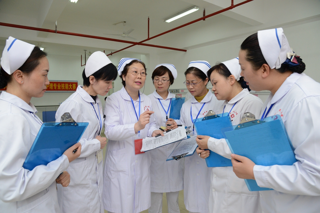 本次大賽設5個分賽場,賽事為賽場式團體賽,以團體總分排列名次。競賽分別設置健康評估和臨床技能操作2個考評站點,各參賽選手首先在健康評估站合作完成臨床案例分析,然后回答相關提問,寫出護理診斷,完成臨床護理操作。賽場及比賽順序通過選手抽簽決定,護理部主任、大科護士長及臨床一線護士長共計35人擔任評委。