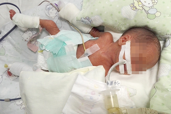 時間回到今年9月2日,霍先生的妻子孕27周,因為“重度子癇”無法繼續(xù)保胎,在我院產科剖宮產生下了體重僅680克(不足1斤4兩)的超未成熟早產兒,由于霍先生的妻子患有不孕癥多年,這個寶寶是艱難通過試管技術懷上的“珍貴兒”,所以夫婦倆要求全力搶救!出生體重僅有680克的超未成熟早產兒,各個器官系統(tǒng)發(fā)育均非常虛弱,即便是對于已有豐富早產兒救治經驗的新生兒科醫(yī)生來說,依然是一個嚴峻的挑戰(zhàn)。新生兒科的楊彤主任和陳健平主任醫(yī)師迅速帶領團隊展開搶救工作。很快,寶寶就借助機械通氣維持呼吸了,并且用上了促進肺發(fā)育成熟的肺表面活性物質。經過努力,寶寶的生命體征暫時平穩(wěn)下來。