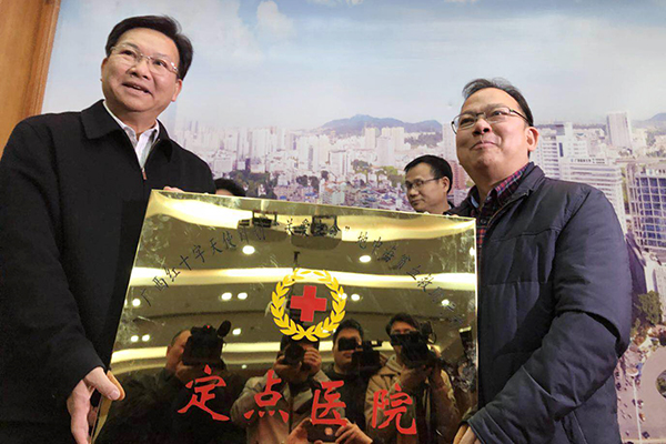 最后,自治區副主席、廣西紅十字會會長黃日波為我院授牌,至此,我院正式成為廣西紅十字會地貧移植資助單位。易平副院長表示,該項目獲得了中國紅十字會陳竺會長,自治區副主席、廣西紅十字會會長黃日波等領導的親切關懷,也得到了上汽通用五菱以及中恒集團大力支持,我院表示感謝。