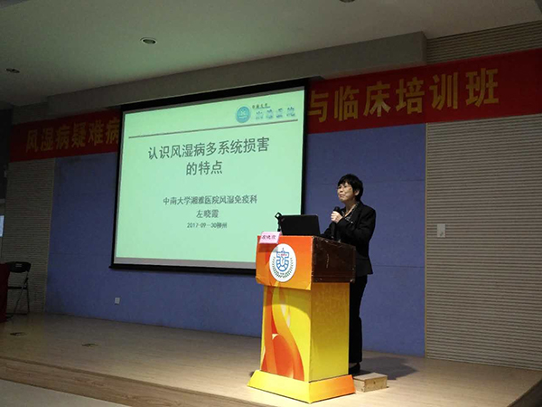 柳州市人民醫(yī)院黎榮山副院長(zhǎng)出席了開幕式并作了熱情洋溢的致辭。此次培訓(xùn)班邀請(qǐng)了湖南省中南大學(xué)附屬湘雅醫(yī)院風(fēng)濕科左曉霞教授,廣東省人民醫(yī)院風(fēng)濕科董光冨教授,廣州中醫(yī)藥大學(xué)第一附屬醫(yī)院風(fēng)濕科林昌松教授,廣西醫(yī)科大學(xué)第一附屬醫(yī)院風(fēng)濕科趙鋮、米存東教授,自治區(qū)人民醫(yī)院風(fēng)濕科林金盈教授,廣西中醫(yī)藥大學(xué)第一附屬醫(yī)院風(fēng)濕科吳金玉教授,廣西中醫(yī)藥大學(xué)附屬瑞康醫(yī)院風(fēng)濕科龐學(xué)豐教授,桂林醫(yī)學(xué)院附屬醫(yī)院風(fēng)濕科莫漢有教授等多位省內(nèi)外知名專家授課。