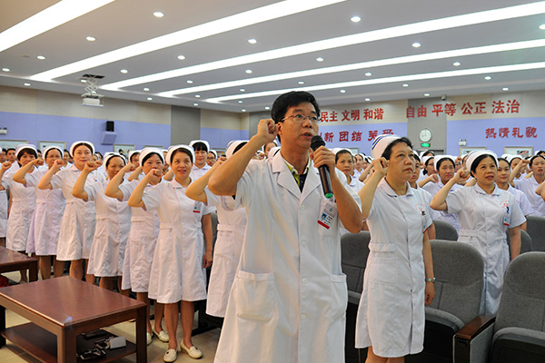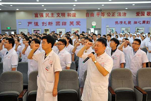 在接下來進行的新職工授衣授帽儀式上,院領導王豫平、廖慶蘭、潘光棟、林正奎為新醫師們舉行了授衣儀式,護理部的主任蔡潔、副主任羅輯、副主任覃秋玉和護士長們也分別為新護士舉行了授帽儀式。隨后新醫師和新護士們分別在黨委書記王豫平和副院長潘光棟的帶領下莊嚴的宣讀了醫生誓詞和護士誓詞,表示要忠誠于醫學事業,履行救死扶傷、促進健康的職責,為醫療和護理事業獻身。儀式結束后,新員工還分批次參觀了院史館。