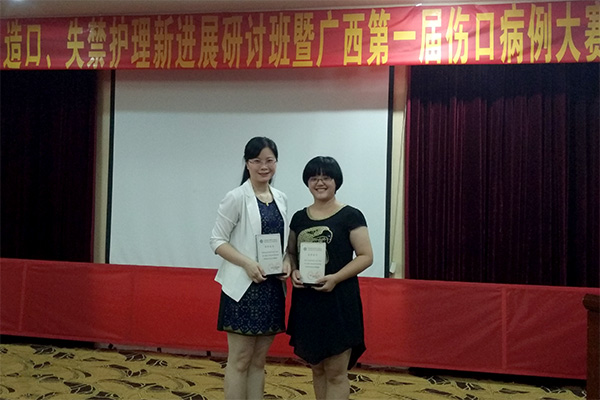 2016年6月19日“廣西第一屆傷口病例大賽”在廣西醫科大學附屬腫瘤醫院如期舉行,本次大賽旨在進一步促進區內傷口、造口、失禁護理學術交流,推進專科發展,普及新知識、新技能、新理念,提高傷口、造口、失禁護理的技術和學術水平。比賽共分為初賽和決賽兩個階段,經過層層選拔,緊張角逐,我院選派的覃琛媛、曹婧兩名選手在大賽中表現優異,從全區20家醫院、43位參賽選手中脫穎而出,以個人總分第一名、第二名的好成績同時榮獲一等獎殊榮。