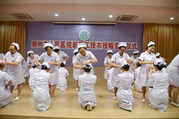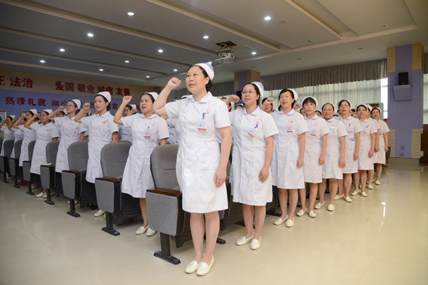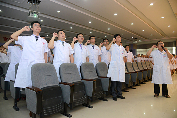 在院歌歡快的旋律伴奏下,副院長潘光棟、副院長易平為新入職醫生授白大褂;護理部蔡潔主任帶領20多名護士長為新入職護士戴上神圣的燕帽。在院領導的引領下,新醫生、新護士舉起右手莊嚴宣誓:用畢生的精力做一名名副其實的白衣天使。