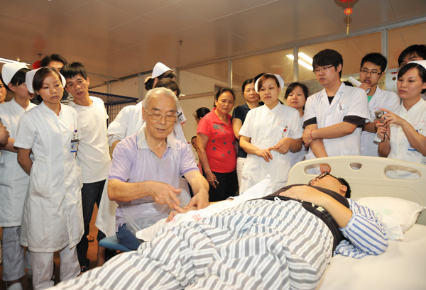 謝永慈先生親臨我院康復(fù)醫(yī)學(xué)科,系統(tǒng)地介紹了康復(fù)護(hù)理的基礎(chǔ)理論,現(xiàn)場傳授康復(fù)訓(xùn)練手法和技巧,對患者進(jìn)行臥床、行走、言語及吞咽等全方位的康復(fù)指導(dǎo),重點強(qiáng)調(diào)預(yù)防畸形,發(fā)揮患者最大潛能,實現(xiàn)自我照顧。謝老先生以詼諧幽默的語言為在場的學(xué)員和患者營造一種歡快的訓(xùn)練氛圍,受益匪淺。