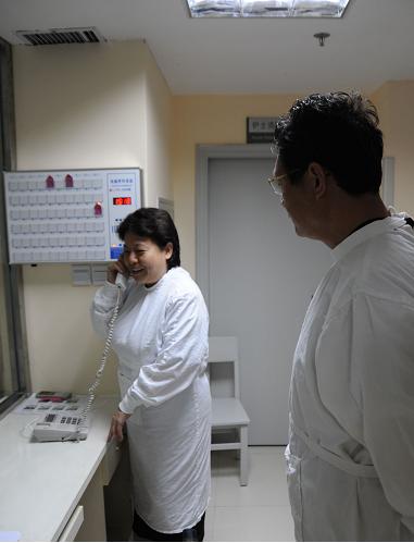 自治區副主席李康(左)通過電話和柳州市第一例甲型H1N1確診患者通話,并祝她早日恢復健康。