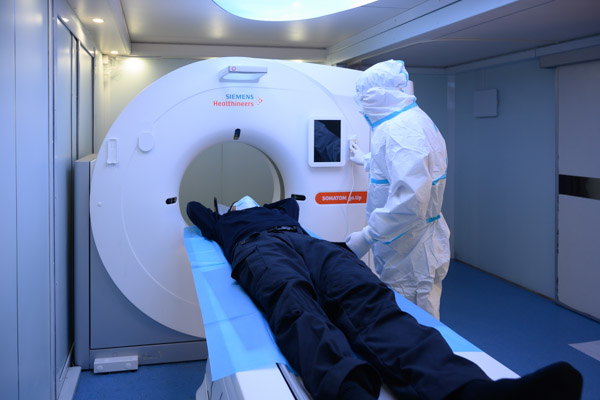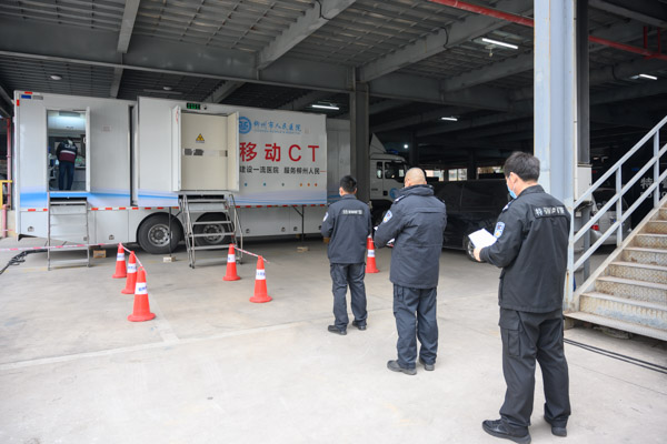 隨后對該單位25名有發(fā)熱和(或)呼吸道癥狀的人員進行肺部CT檢查,核對患者信息無誤后,完成CT掃描、圖像傳輸。待檢測人員完成所有檢查項目,醫(yī)務人員在完成對移動實驗室、移動CT專用車內(nèi)部環(huán)境的消毒后,按要求到指定地點脫卸防護用品,并負責醫(yī)療垃圾密閉保存集中轉(zhuǎn)運的消毒處理。