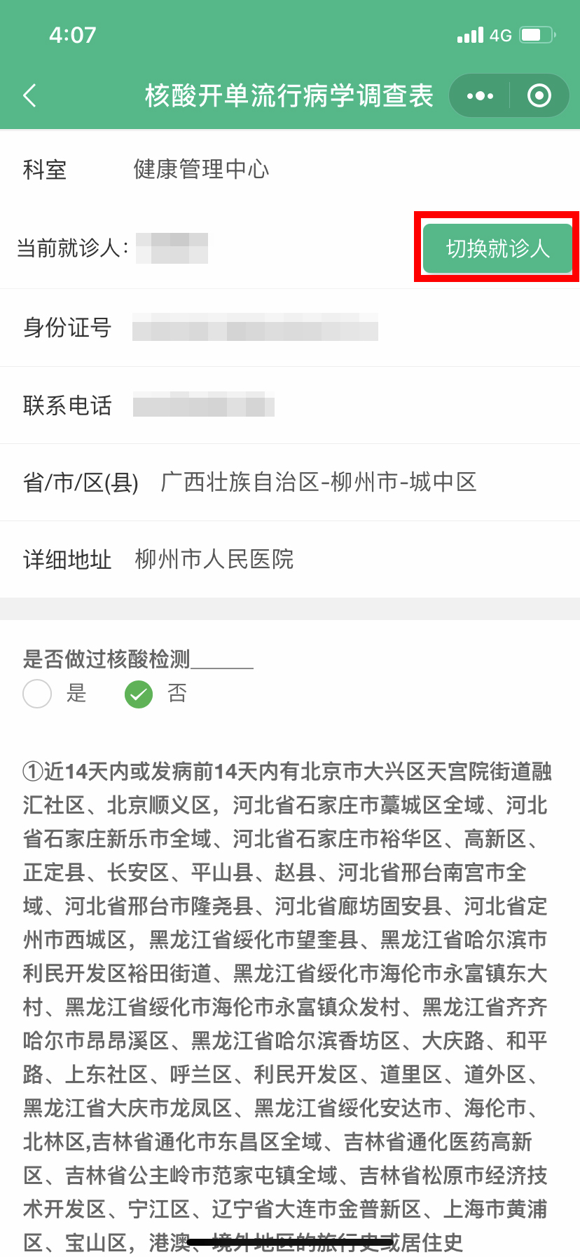 3.根據自己的實際情況填寫流行病學調查表,填完后會跳轉到核酸開單項目確認。