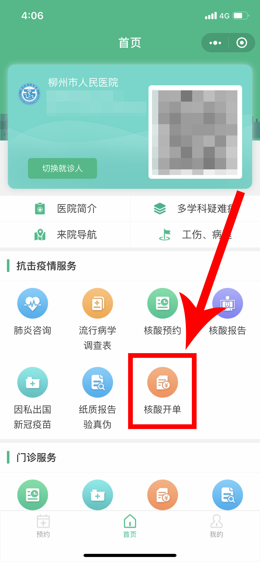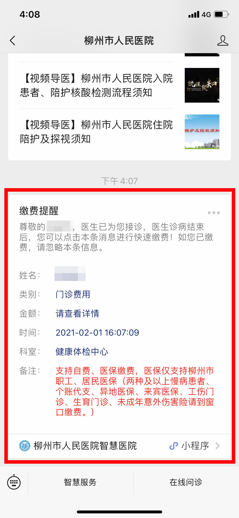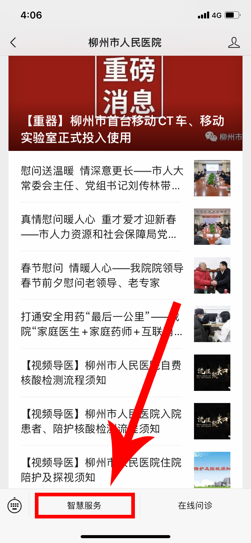 1.關注“柳州市人民醫院”微信公眾號,點擊下方的智慧服務菜單,進入首頁。