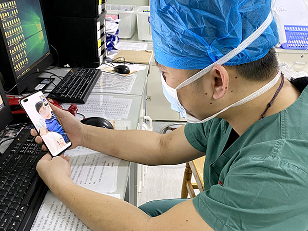 短暫的年夜飯結束后,覃醫生趁著空閑時間接通了妻子的視頻通話。妻子說家里一切安好,兩個孩子也很聽話,讓丈夫安心守衛手術室。妻子與孩子們的理解與笑臉給了覃醫生繼續戰斗的勇氣和動力。溫情的視頻通話結束沒多久,又有急診手術送上來,覃醫生很快再次投入到戰斗中。