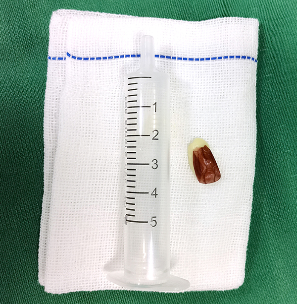 患兒進入手術室時面色慘白,口唇發紫,已經是缺氧狀態了,解除異物恢復供氧刻不容緩。麻醉和護理團隊馬上展開行動,通過特殊手法正壓通氣改善了患兒的術前缺氧狀況,并以最快速度打上了留置針。缺氧狀態的改善給了耳鼻咽喉科醫生充足的操作空間,只見他們迅速通過內窺鏡定位了狡猾的花生米,電光火石間手起鉗落,一把捕獲“罪魁禍首”——一顆小小的花生米。患兒解除了氣道梗阻狀態,隨著氧氣順暢的供應,孩子的臉色逐漸紅潤了起來,一場緊張的“氣道戰”取得了完美的勝利!
