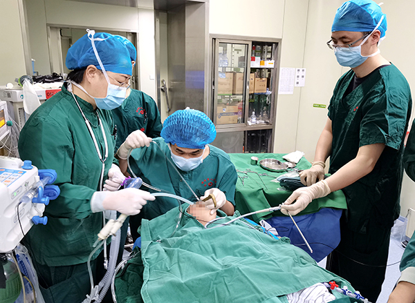 情況十分緊急!雖然該患兒所誤吸的異物并未完全堵塞氣管,但稍有不慎將會發生異物移位,危及患兒生命。麻醉科馬上啟動了麻醉科氣道異物救治應急預案,由麻醉科學科帶頭人游志堅主任組建了搶救小組進入手術室做搶救準備,耳鼻咽喉科也派出了由磨賓宇副主任帶領的精英團隊來到現場。