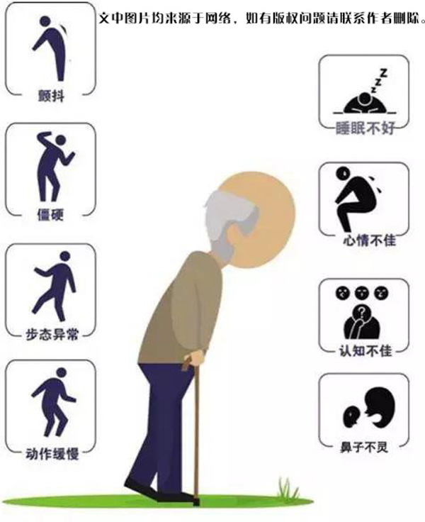 帕金森多在60歲以后發(fā)病,隨著發(fā)病逐漸加重,剛開始一側手、腳、頭部抖動(震顫)、僵硬、動作不靈活,逐漸演變面容呆板(面具臉)、動作緩慢、寫字越寫越小(小寫癥)、走路時不擺動胳膊、身體向前沖、膝關節(jié)屈曲、起步轉身坐下困難,晚期走路時很難邁開第一步、走路易跌倒,生活不能自理,需要坐輪椅或者臥床不起,除運動癥狀外,帕金森病還具有很多非運動癥狀,包括嗅覺失靈、情緒低落、睡眠問題、癡呆、頑固性便秘等。晚期患者經(jīng)常出現(xiàn)幻覺,看到房間出現(xiàn)了人、動物等,尤其傍晚及夜間明顯,嚴重影響患者的生活。