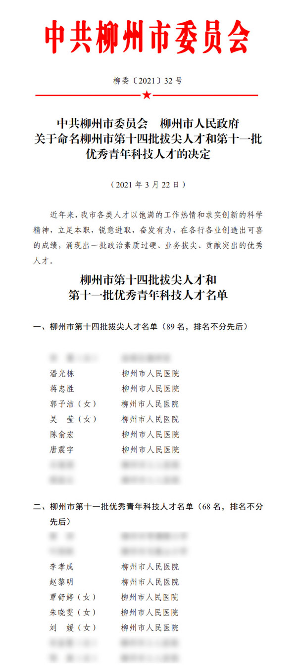 隨后,與會領導為獲獎單位及個人頒獎,我院肝膽胰外科專家、副院長潘光棟作為代表上臺領取柳州市第十四批拔尖人才榮譽證書,同時袁淑芳、周至品、盧宇三位博士作為新引進高層次人才代表參會,我院共有六位專家被命名為柳州市第十四批拔尖人才,五位專家被命名為柳州市第十一批優(yōu)秀青年科技人才。