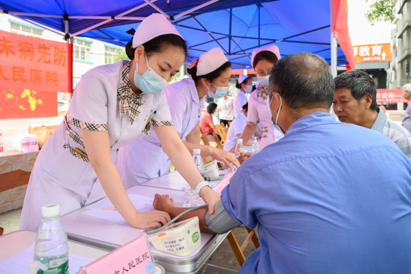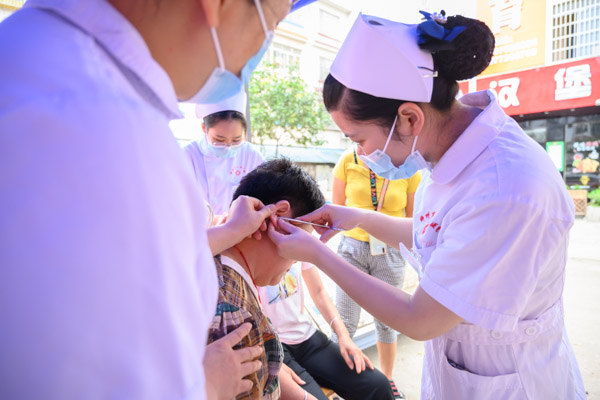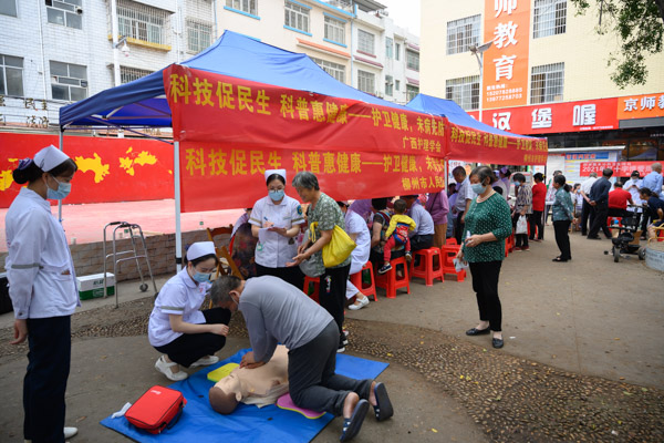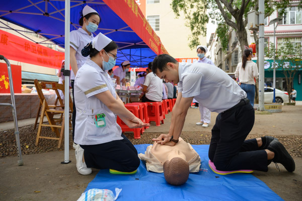 本次活動的主題為科技促民生,科普惠健康——護衛健康,未病先防。活動現場,我院護理人員耐心細致地向群眾普及日常心理健康保健知識,新冠肺炎防控要點,正確的洗手、戴口罩方法,并提供高血壓、糖尿病等常見慢性病的居家護理要點及用藥指導。為群眾量血壓、測血糖,提供合理的膳食、運動指導。現場演示了發生心臟驟停后應立即進行的心肺復蘇術,以及AED的使用方法。此外,還為群眾帶去了刮痧、耳穴貼壓、拔火罐等中醫特色服務,并提供免費的中藥茶飲和健脾祛濕香囊。