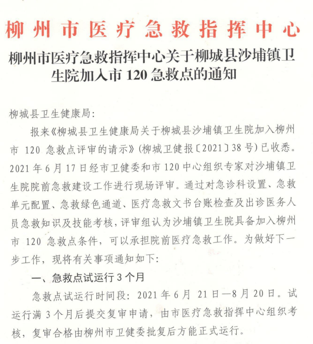 當日下午,從柳州市醫療急救指揮中心傳來令人振奮的消息,評審組認為沙埔鎮衛生院具備加入柳州市120急救點條件,可以承擔院前急救工作,正式進入試運行階段,三個月后將迎來復審。