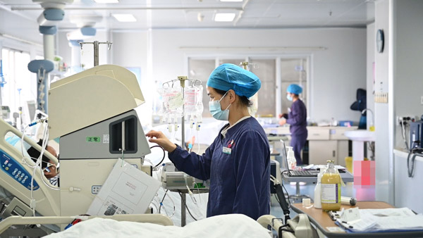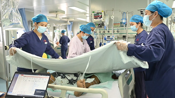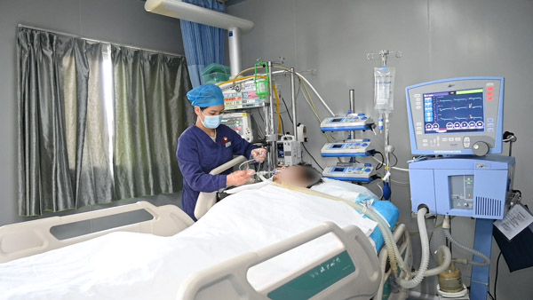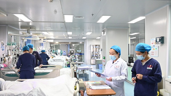 寬敞明亮的病房里,病床依次排開,心電監護儀、呼吸機、CRRT、ECMO等先進醫療搶救設備一應俱全。護士們穿梭其中,細心觀察監護儀上的生命體征,嫻熟地進行著各種操作。安靜而有序,但是患者身上插滿的各種管子、病床旁的各種儀器,都讓人感受到不一樣的沉重。
