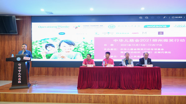 10月14日上午,中華兒慈會微笑行動專項基金、微笑行動組織主辦,柳州市人民醫院承辦的“2021柳州微笑行動”在我院正式啟動。“微笑行動”大中華區總裁王曉衛教授,柳州市衛健委黨組副書記、副主任趙海,我院黨委書記劉兵,四川大學華西醫院鄭謙教授及“微笑行動”相關專家、志愿者參加啟動儀式,儀式由我院副院長石展英主持。