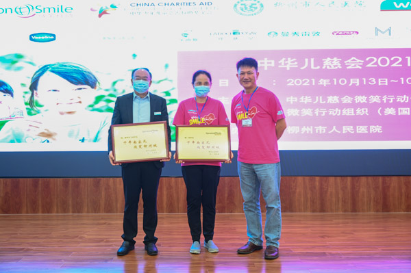 “微笑行動”大中華區總裁王曉衛教授向柳州市人民醫院等四家單位贈予“微笑行動”牌匾。