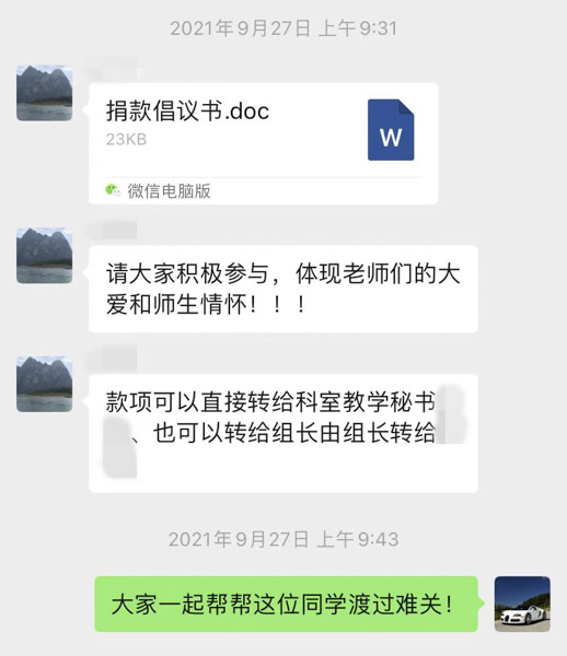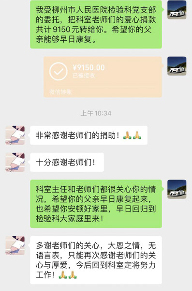 我院檢驗科黨支部、醫學檢驗科教研室了解到該情況后,向科室全體職工發出倡議,號召大家伸出援助之手,用愛心托起生命的希望。一時間,科室全體人員積極響應,慷慨解囊,僅兩天時間,就有105人捐款共計9150元,通過微信轉賬的方式送到了羅同學手上,這其中的每一筆捐款都飽含著對學生的深切關愛之情,雖然力量有限,但是大家都希望羅同學的家庭能夠走出陰霾。