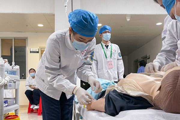 競賽以醫(yī)護組隊形式進行考核,每組5人,根據(jù)考官給出的隨機題目,各參賽隊現(xiàn)場模擬創(chuàng)傷突發(fā)事件現(xiàn)場展開救援。“患者男性,高空墜落傷2小時,神志昏迷,嘆息樣呼吸,口鼻腔有流血,左下肢多處腫脹及畸形……”根據(jù)模擬病情,創(chuàng)傷團隊立即為患者開通創(chuàng)傷綠色通道,迅速評估,制定診療方案,組長發(fā)出搶救指令,小組成員各司其職,搶救工作全面展開。醫(yī)護人員運用創(chuàng)傷檢傷查體、開放靜脈通道、包扎止血、骨折固定術(shù)、胸腔閉式引流、床邊B超、氣管插管等各類急救措施,對患者進行了全方位的有效救治。整體配合默契,操作流暢,充分展示了急診醫(yī)護創(chuàng)傷團隊的救治水平。