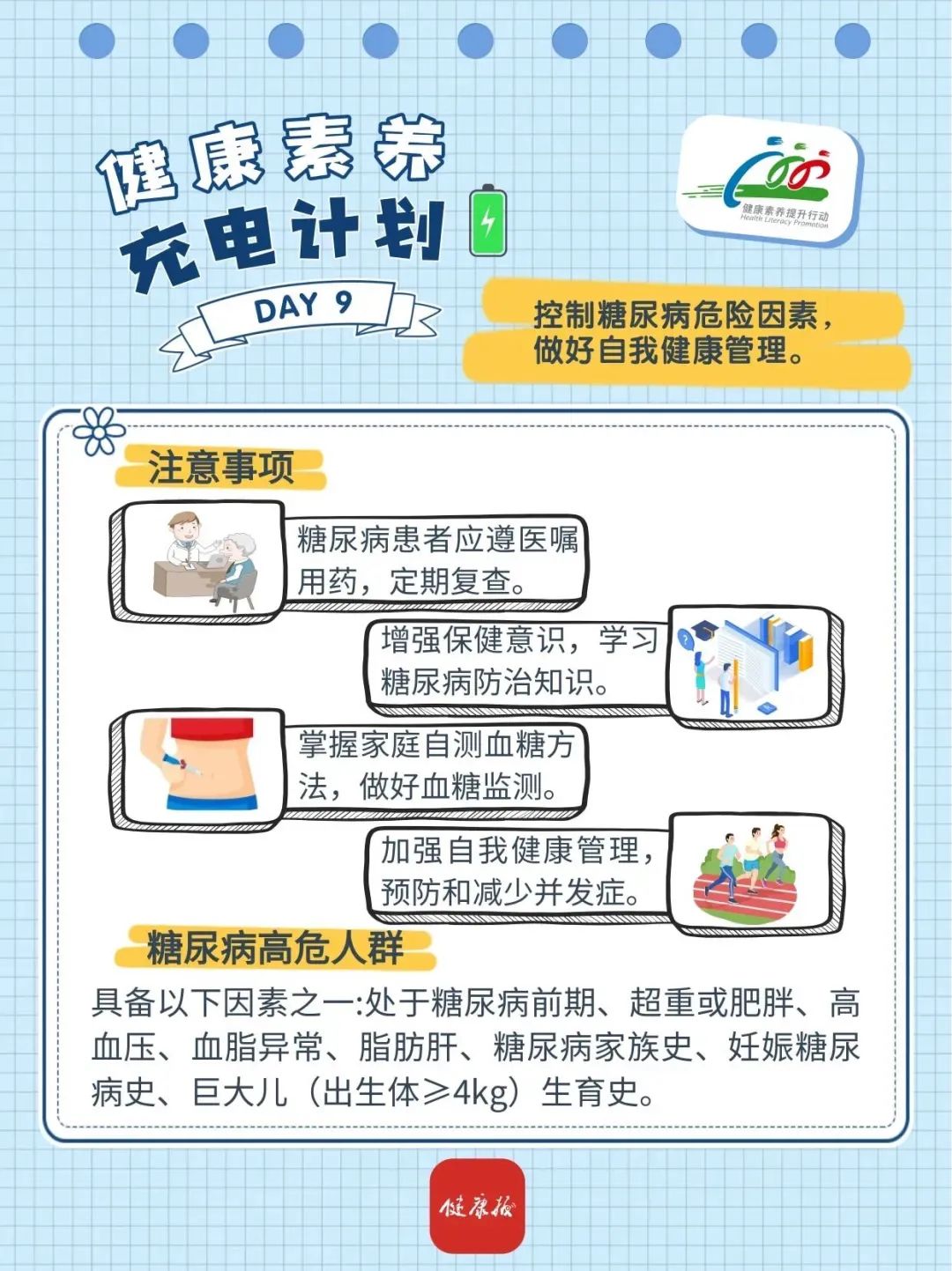 具備以下因素之一,即為糖尿病高危人群:處于糖尿病前期、超重或肥胖、高血壓、血脂異常、脂肪肝、糖尿病家族史、妊娠糖尿病史、巨大兒(出生體重≥4kg)生育史。糖尿病患者應遵醫囑用藥,定期復查。增強自我保健意識,主動學習糖尿病防治知識,對疾病有全面正確認識,掌握家庭自測血糖的方法,做好血糖自我監測,加強自我健康管理,預防和減少并發癥。糖尿病患者及糖尿病高危人群要養成健康的行為生活方式,控制血糖、血壓、血脂和體重,做到合理膳食、科學運動、不吸煙、不喝酒、規律生活。