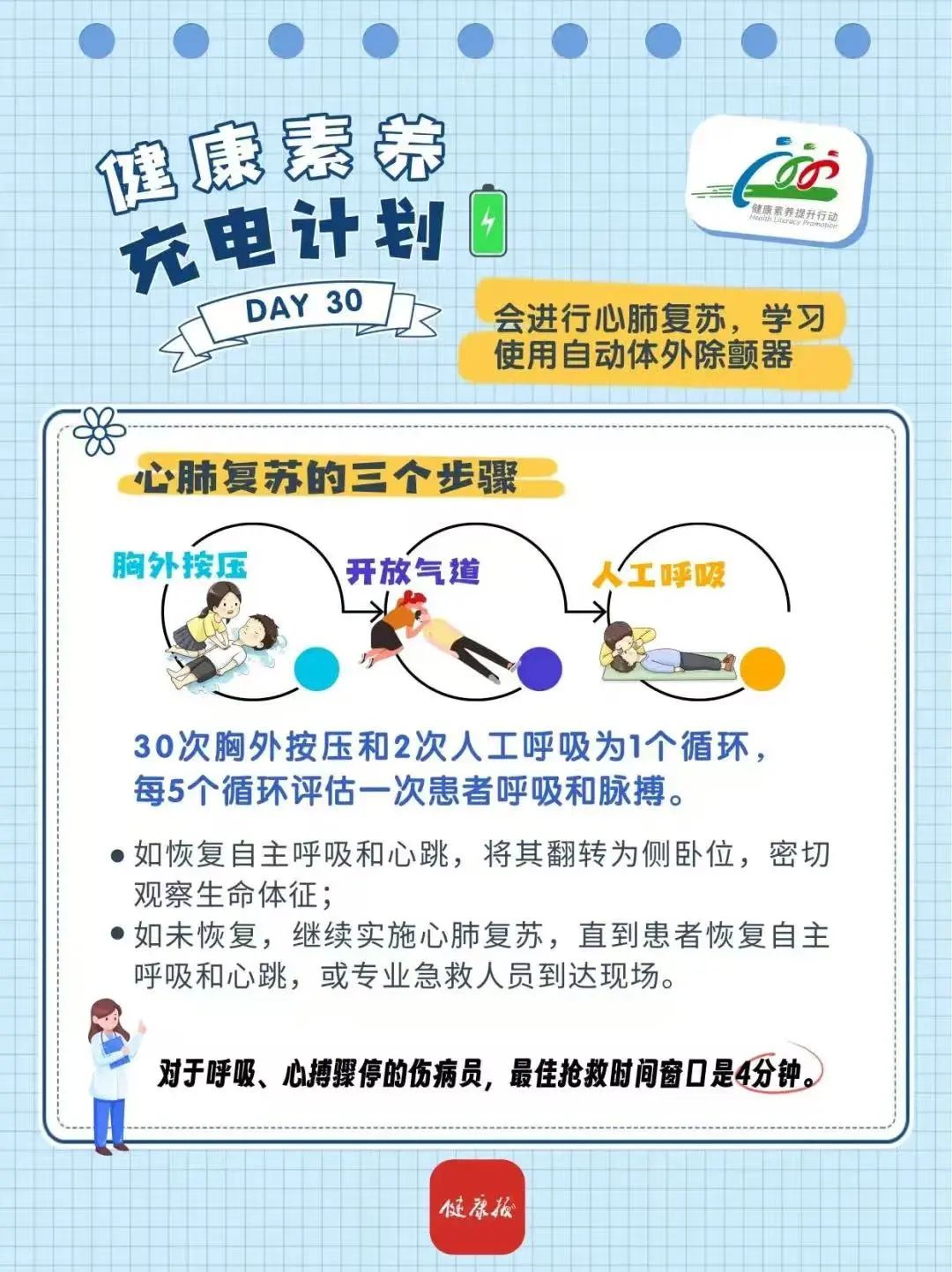 為倡導文明健康生活方式,提升居民健康素養(yǎng)水平,我們聚焦《中國公民健康素養(yǎng)——基本知識與技能(2024年版)》(簡稱“健康素養(yǎng)66條”)開展健康知識普及。本期內(nèi)容為:心肺復蘇怎么做、AED怎么用?