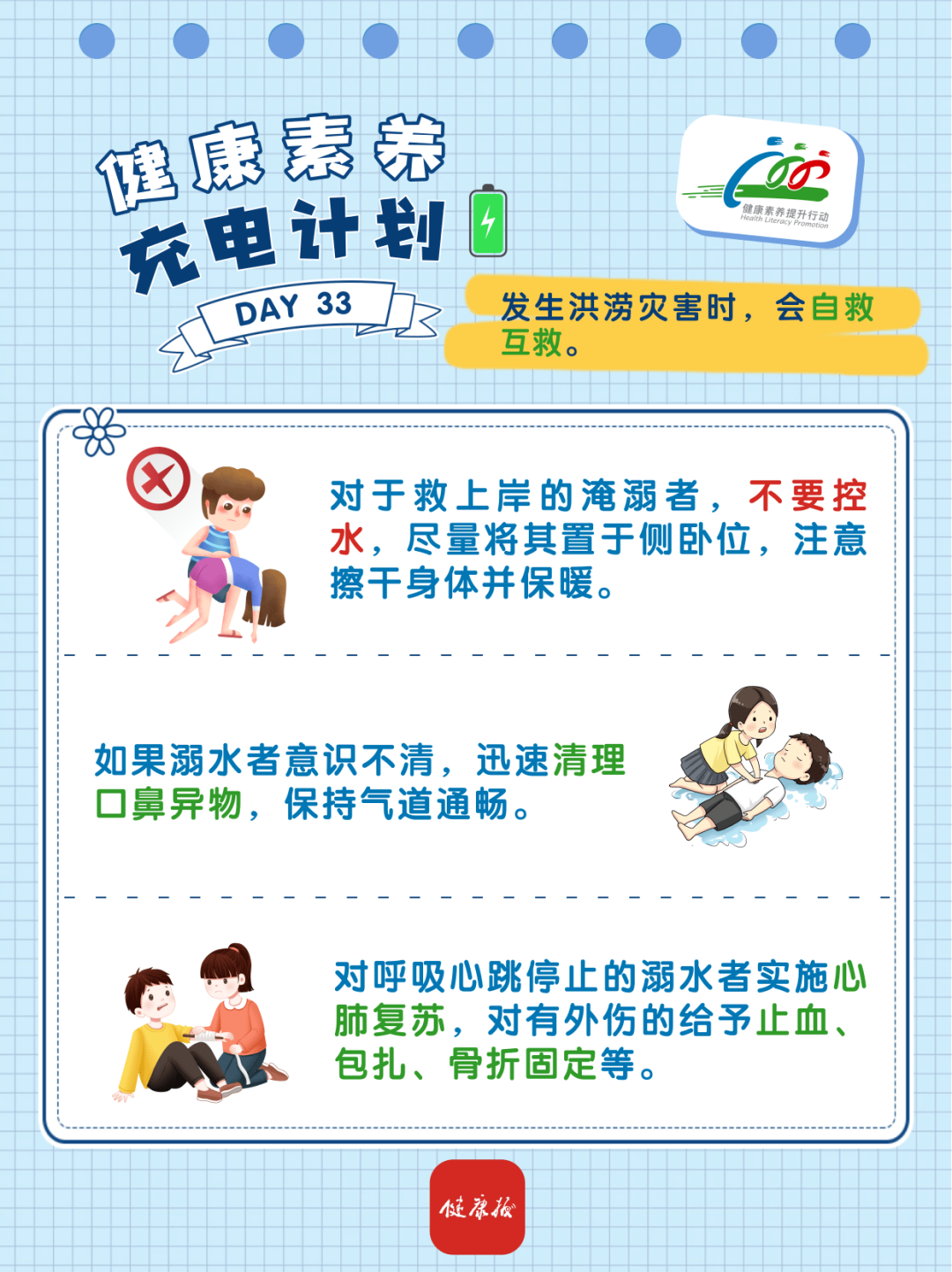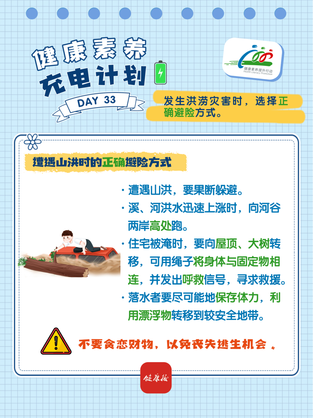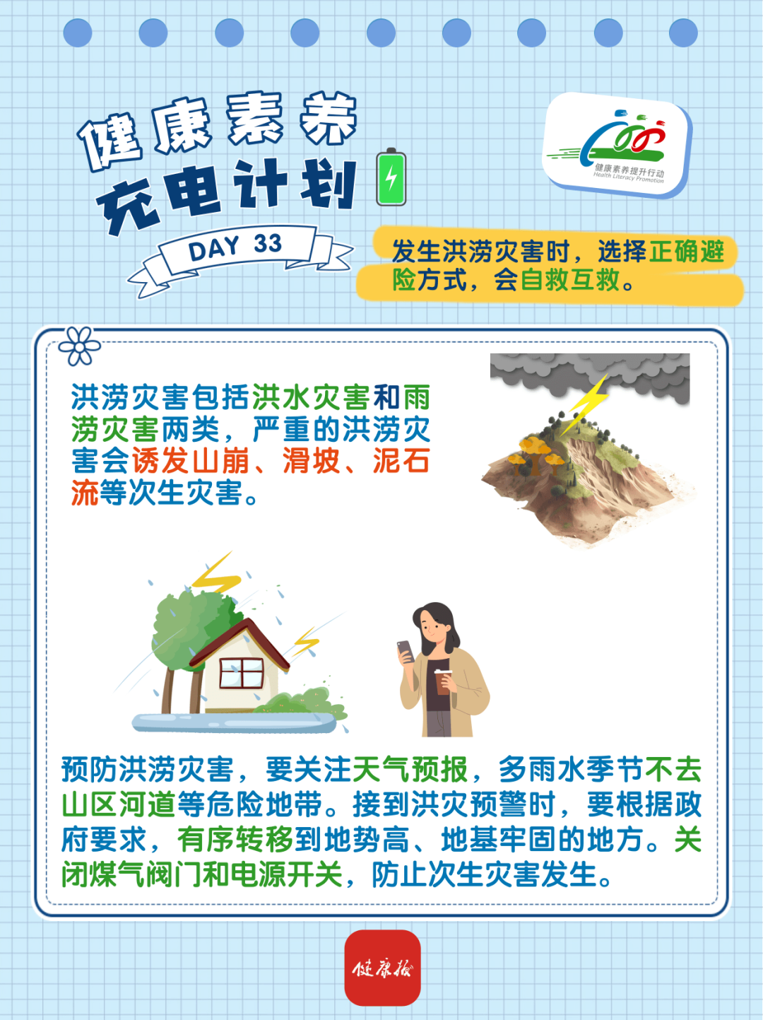為倡導(dǎo)文明健康生活方式,提升居民健康素養(yǎng)水平,我們聚焦《中國公民健康素養(yǎng)——基本知識與技能(2024年版)》(簡稱“健康素養(yǎng)66條”)開展健康知識普及。本期內(nèi)容為:發(fā)生洪澇災(zāi)害時(shí)該怎么避險(xiǎn)?