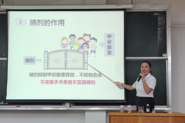 此次比賽得到了醫院的高度重視,從接到通知到正式比賽,只有短短的2周,時間緊,任務重,護理部在分管院領導潘光棟副院長的指導下,迅速制定參賽方案,集全院之力幫助張莉旋快速進入狀態。潘光棟副院長親臨試講現場指導;乳腺甲狀腺外科一病區張敏敏副主任將自己的大賽經驗傾囊相授;教學部黃金秀老師給了很多選題的好建議;科護士長們從教態、課件、語言表達、互動設計等方面給予選手全方位的指導。
